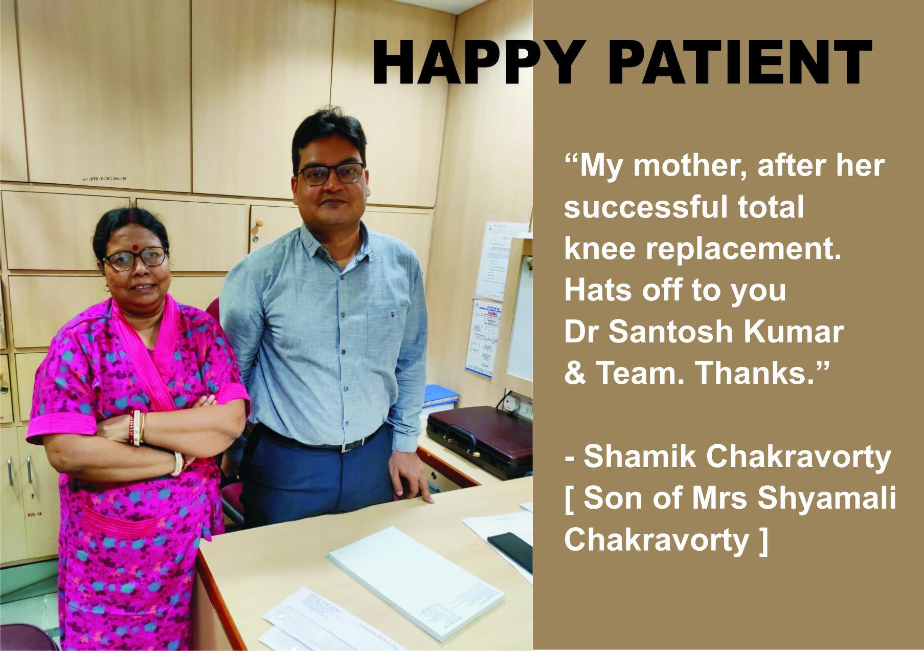 "I have been suffering from knee pain since 2005. I got Dr. Santosh Kumar’s contact through internet. He advised for knee replacement. Although I was scared by many, yet Dr. Kumar explained all in details and operated. He and his team had been cooperative".